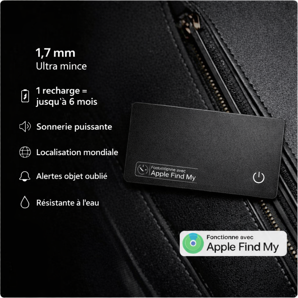 Oui. La carte est compatible avec les téléphones iPhone et fonctionne avec l’écosystème Apple Localiser (Find My). Aucun abonnement n’est requis.